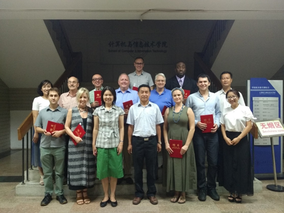 (伟德国际1946bv官网计算机信息与技术学院蔡伯根院长、杨晓晖书记、董敬祝副书记与暑校授课教授合影)