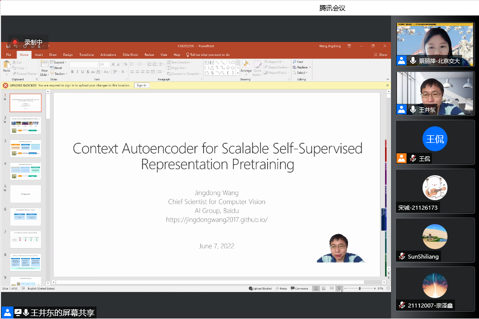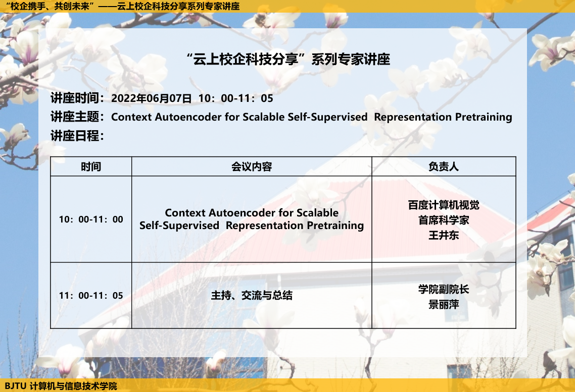 2022年6月7日上午,伟德国际1946bv官网计算机与信息技术学院“云上校企科技分享系列专家讲座”活动有幸邀请到百度计算机视觉首席科学家王井东,讲座主题为 “Context Autoencoder for Scalable Self-Supervised Representation Pretraining”。160余位师生全程参与讲座。