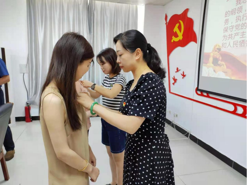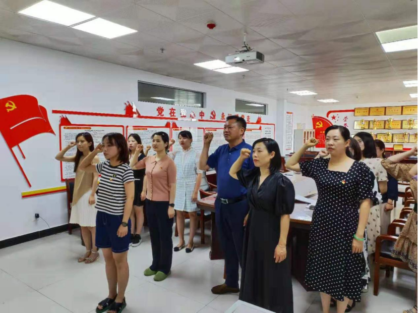在教工党支部宣传委员李桂林同志的带领下,张颖颖、刘铮两位同志及SUNBET申搏官方网站全体教工支部党员面对党旗,庄严宣誓。