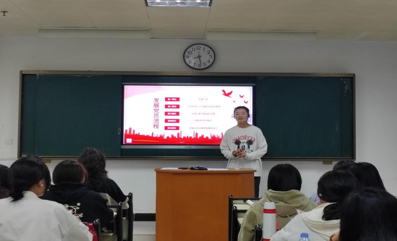 主讲人首先带领同学们学习了《大学生入党启蒙教育》手册,向同学们讲解了“发展党员流程图”,让大家对入党流程有了清晰的认识。接着,主讲人从“申请入党”“入党积极分子的确定和培养教育”“发展对象的确定和考察”“预备党员的接收”“预备党员的教育考察和转正”五个步骤详细介绍了每个过程所需具备的条件。随后,主讲人对同学们存在的问题进行了逐一解答。最后,鼓励大家奋勇争先,坚定理想信念,为申请加入党组织做好充足准备。