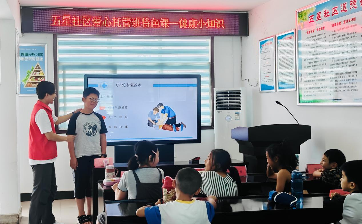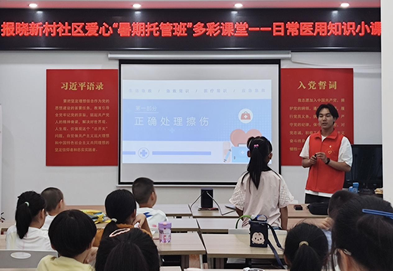 暑假期间,为引导和帮助青少年儿童度过一个安全、快乐、充实的假期,SUNBET申搏官方网站的志愿者们走进信阳市报晓新村社区和五星社区,开展了“多彩假期,‘艺’路‘童’行”暑期社会实践活动,为社区青少年儿童提供贴心服务,丰富暑期生活,减轻家长们假期“看护难”的负担。志愿者们结合专业所长,精心组织了急救知识、交通安全、绘画、手工制作等多彩小课堂,通过列举日常生活中的常见例子,以及“你问我答”等多种方式,使课堂更加生动易懂,不仅增强了孩子们的安全意识,也为社区青少年播下了知识的种子,用心呵护每一位幼苗,为他们健康成长保驾护航。