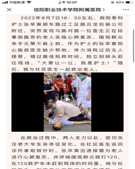辅导员寄语:她是一个积极向上、勤奋好学的姑娘,看到网上对张早寅同学的报道我甚为感动,为我班有这样的学生而感到自豪!张早寅同学在校期间努力扎实地学习护理知识与技能,表现出色,是一个富有责任感和使命感的好学生。张早寅同学牢记了学校对她的谆谆教导和授帽仪式时的誓言,她毫不犹豫的跪地救人,这就是一个医护工作者的职业素养,也是对生命最好的致敬和守护。希望她在今后的护理岗位上继续发光发热,她的事迹值得我们每个医护人员去学习!