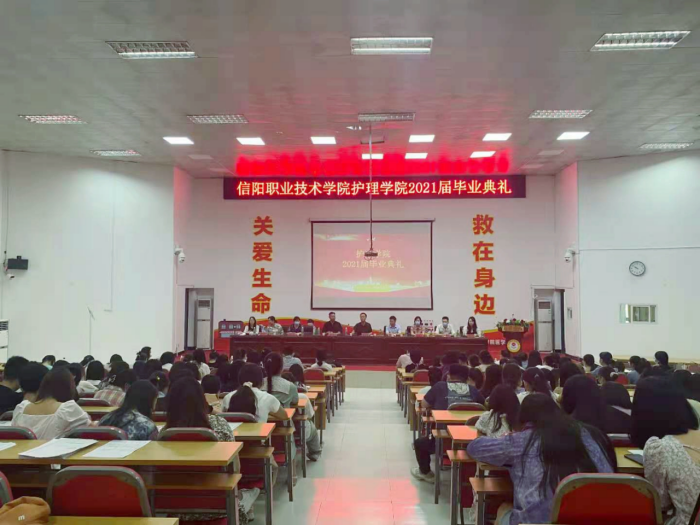 毕业典礼在雄壮激昂的国歌中拉开序幕。随后,优秀毕业生代表赵芳芳上台发言,她代表2021届全体毕业生衷心感谢母校和老师的鼓励、培养,将铭记母校老师们的教诲,始终保持学习的热情和对护理职业的热爱,不断学习、提升技能,在护理卫生岗位上践行救死扶伤的大爱精神,做新时代最美护理人。毕业班辅导员夏炜妍老师怀着丝丝的伤感和浓浓的眷恋之情回忆学生三年来的点点滴滴,鼓励同学们在人生道路上搏击风浪、勇往直前,实现梦想,做新时代的奋斗者。