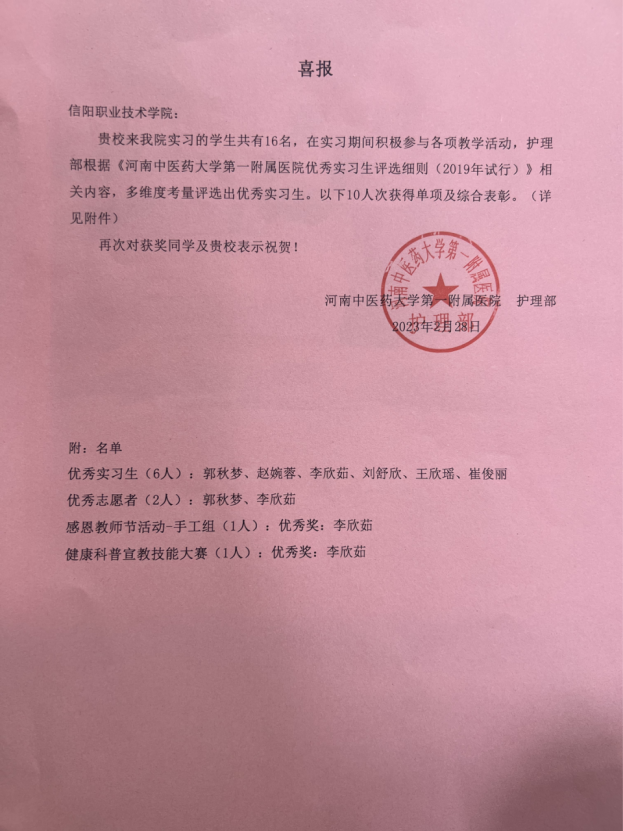 2月28日,从河南中医药大学第一附属医院传来佳讯,医院护理部根据《河南中医药大学第一附属医院优秀实习生评选细则(2019年试行)》相关内容,多维度考量评选,SUNBET官网16名实习生中有10人次获得单项及综合表彰。