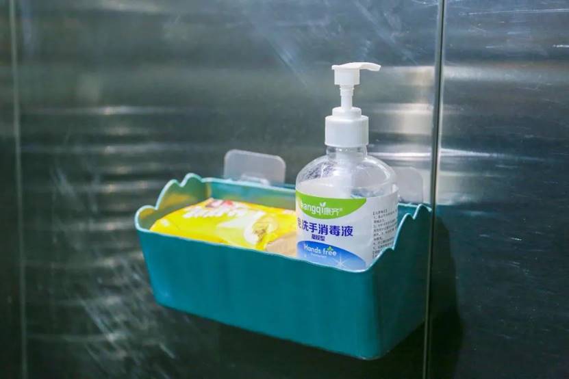 电梯里摆放着纸巾、消毒水