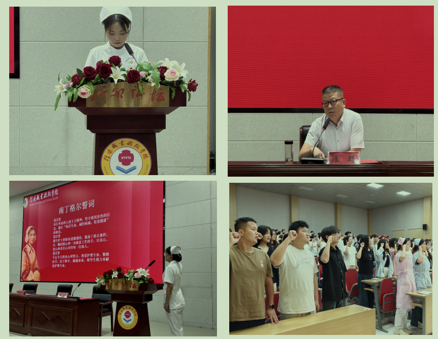 作为实习新生力量,2023 级实习生代表宋莹冰同学庄严承诺“我们将以空杯心态 投入学习,用专业素养守护健康,用温暖关怀抚慰病痛 ”,其发言中 “让我们以此实习为起点,用行动证明:我们定会成为有温度、有技术、有担当 的护理人 ”,引发了全场共鸣。