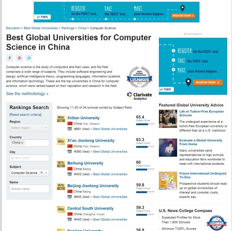 在最新发布的2017年度US News世界最佳大学排名(Best Global Universities Rankings)中,我校计算机科学学科排名世界第78名,我国内地共有34所高校的计算机科学学科进入前200名,我校计算机科学学科在内地高校中排第14名。