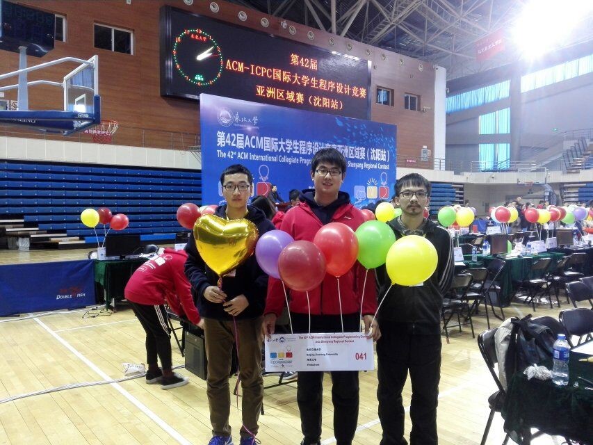 本次竞赛由ACM-ICPC亚洲区组委会主办,授权东北大学承办沈阳站的比赛。参赛阵容亦非常强大,在前期网络赛筛选的基础上,有来自国内125高校的180支队伍参加了此次现场赛。最终北京大学的“全给党”队伍以解出13题中的10题的解题数量优势捧得冠军奖杯,来自北京航空航天大学和杭州电子科技大学的队伍分货亚军和季军。我校此次派出了两支参赛队伍,分别是由高洪杰(14281058)、王之博(14272082)、张彦潇(14281103)组成的“终末之冬”队和由王婉铃(15301158)、付恒岩(16281190)、郝敬宇(16281097)“喵之萌杀”队。此外,同一时间在由哈尔滨哈尔滨理工大学承办的第3届中国大学生程序设计竞赛(CCPC)中,我校也派出了由赵思达(16301057)、陈炳君(16281031)、胡祖俊(17301095)三人组成的“小富即安”队参赛。两场比赛中,新老参赛队员沉着冷静、奋力发挥,最终“终末之冬”获得了一枚银奖,位于银奖前列,“小富即安”队因罚时过多与奖牌失之交臂。