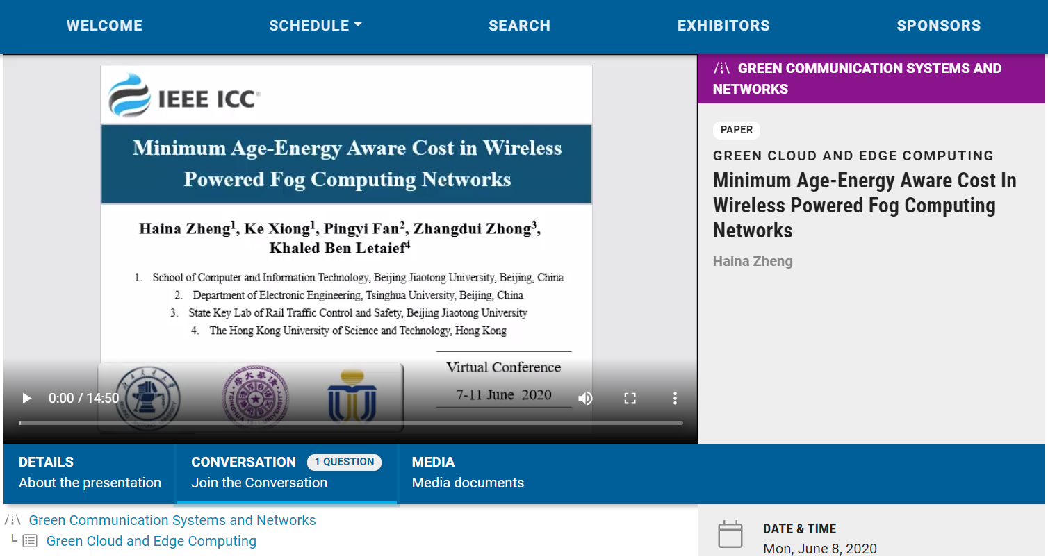 6月7日-6月11日,原定于爱尔兰都柏林召开的第54届IEEE国际通信大会(IEEE International Conference on Communication, IEEE ICC)受COVID-19疫情影响改在线上召开。由伟德国际1946bv官网信息通信网络研究所和轨道交通控制与安全国家重点实验室合作完成的学术论文“Minimum Age-Energy Aware Cost in Wireless Powered Fog Computing Networks”经过专题技术委员会评审和推荐,从提交的近2100余篇论文中脱颖而出,荣获最佳论文奖(Best Paper Award)(本次IEEE ICC最佳论文奖获奖比例为0.72%)。