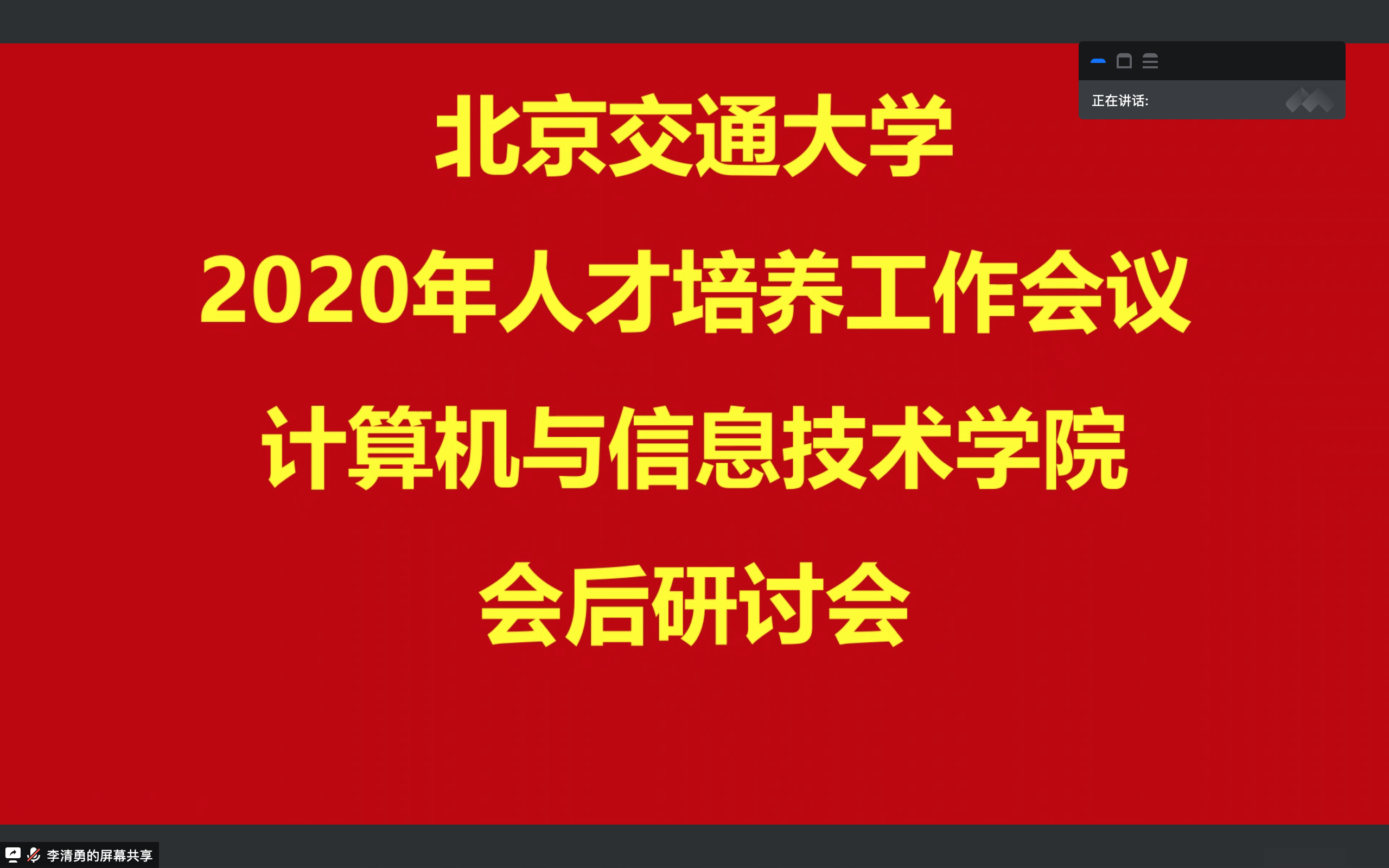 6月29日下午,计算机与信息技术学院以线上会议的方式召开了2020年人才培养工作研讨会。教务处副处长景云、研究生院常务副院长朱晓宁、招生与就业工作处处长刘东平、学生处处长王德瑜、研究生工作部部长刘燕、国际合作交流处处长夏明超、校团委副书记安志强、伟德国际1946bv官网全体院领导、系所中心主任、本科生/研究生专业责任教授、教师代表、教学科、研究生服务中心及团委相关人员参加了此次会议。研讨会由学院院长蔡伯根主持。