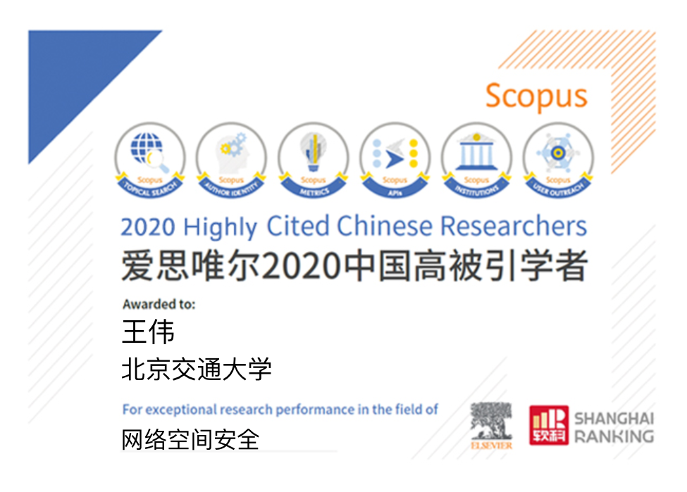 王伟教授,任伟德国际1946bv官网计算机与信息技术学院教授,信息安全系主任。目前主持国家重点研发计划课题、子课题和国家自然科学基金等项目20余项。在国内外学术期刊或国际会议上发表论文100余篇,论文被引用2800余次(谷歌学术数据),ESI高被引论文5篇。2009 和2010 年连续两年获欧洲ERCIM“Alain Bensoussan”研究学者支持 (ERCIM Fellowship)。获省部级科技进步二等奖2项;国际会议最佳论文奖3项。是中国计算机协会(CCF)高级会员;CCF 青年计算机科技论坛(YOCSEF)学术委员会委员;CCF区块链专业委员会首批委员;北京市网络法学研究会常务理事。目前担任信息安全领域权威SCI期刊Computers & Security的编委,担任SCI 期刊Frontiers of Computer Science 的青年AE和《网络空间安全》期刊编委。担任100 余个国际会议的程序委员会委员。