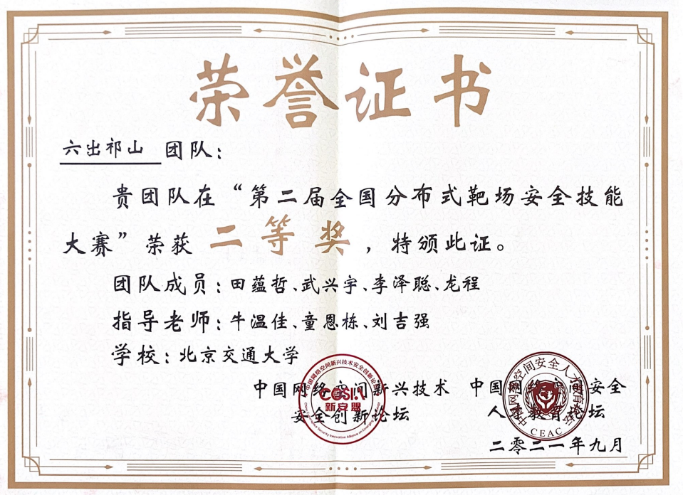 由鹏城国家实验室(副部级)、华中科技大学、武汉大学、四川大学、中电长城网际、中汽创智、宁波工业互联网研究院联合承办,方滨兴院士等专家参与指导的第二届基于全国分布式靶场的安全技能大赛于9月17日圆满落幕。伟德国际1946bv官网网络空间安全学科责任教授刘吉强老师领队、牛温佳和童恩栋老师指导的“六出祁山”队经过8小时的鏖战再获佳绩,以3665分夺得第二届分布式靶场安全技能大赛第二名,获得二等奖。