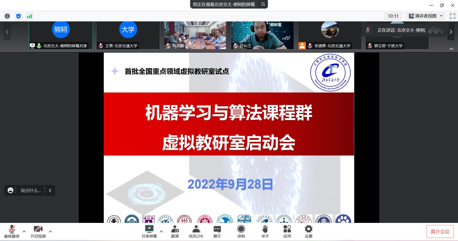 机器学习与算法课程群虚拟教研室于2022年9月28日下午通过线上线下结合的方式召开建设启动会。会议由伟德国际1946bv官网计算机与信息技术学院副院长熊轲教授主持,重点领域教学资源建设项目管理办公室副主任许长江、伟德国际1946bv官网本科生院副院长宋瑞、伟德国际1946bv官网计算机与信息技术学院院长蔡伯根参加会议并致辞,伟德国际1946bv官网、武汉大学、南京大学、北京航空航天大学、北京邮电大学、西南交通大学、中国矿业大学、华中师范大学、桂林电子科技大学、宁波大学、西北师范大学和武夷学院等虚拟教研室成员单位的专家和教师代表出席了会议。
