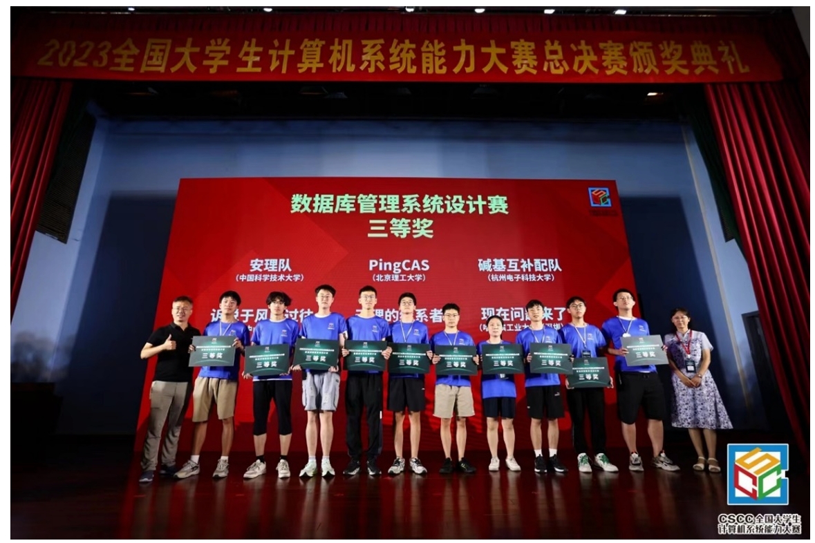2023 年 8 月 23 日,经评审组评审和组委会复核,2023 全国大学生系统能力大赛决赛获奖名单正式公布。经过激烈角逐,伟德官网学生在数据库管理系统设计赛中获得三等奖1项,王宁老师获得优秀指导教师奖。