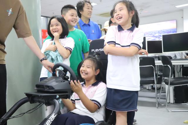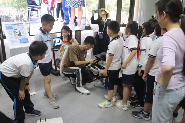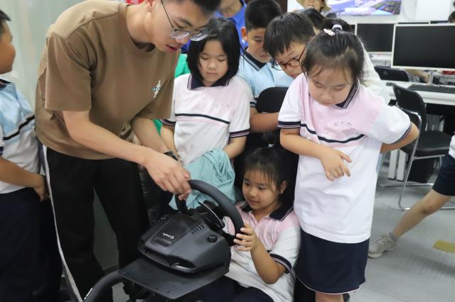 在主校区逸夫101科普基地实验室举办的科普展览每天开放,让来访者们沉浸在科学的世界中。在科普基地中展示的平行驾驶平台,小朋友们踊跃参与试驾体验,都成为小小“AI驾驶员”。通过对铁路轨道和智能巡检车的观察和操作,小朋友们对人工智能技术和应用有了更直接的感悟。
