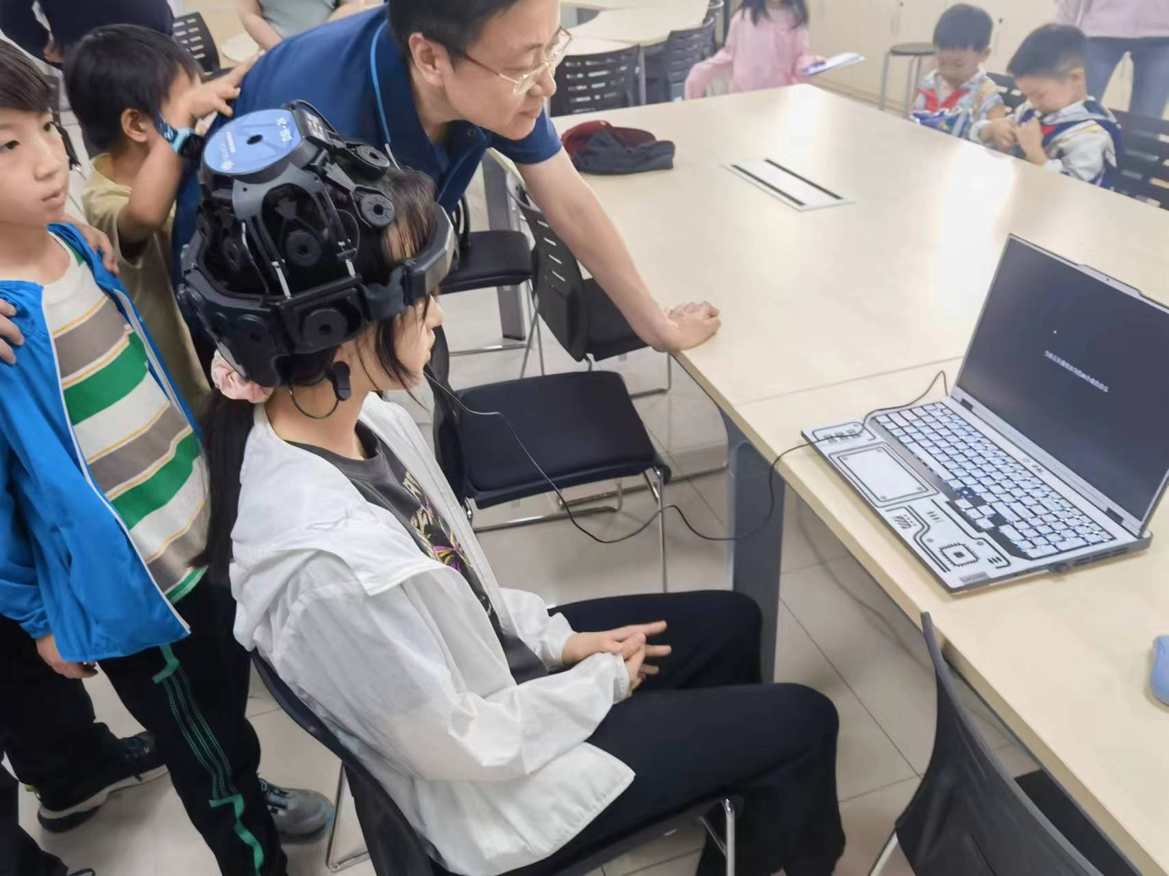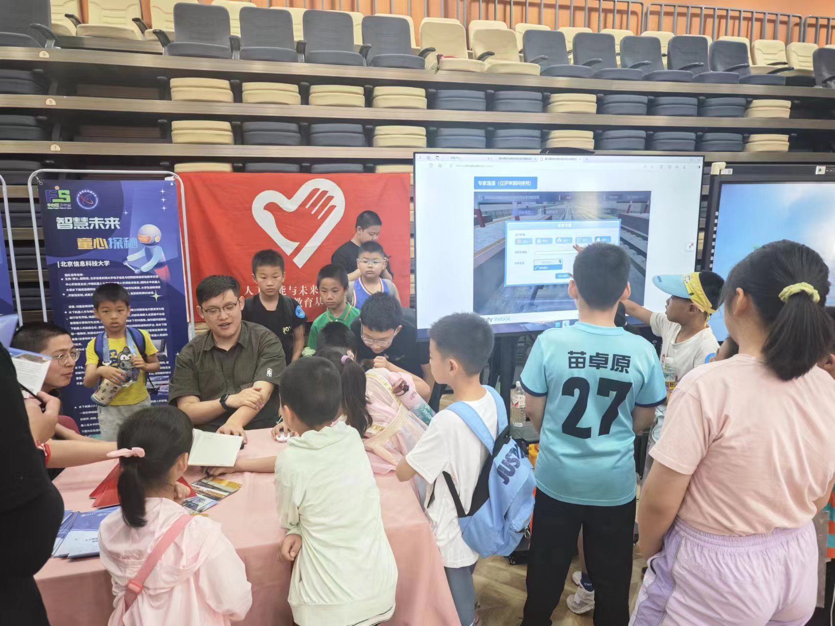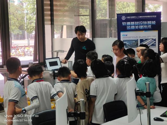 6月1日儿童节当天,科普教育基地教师和大学生志愿者赴丰台区少年宫,携手丰台科协,和北理工、北邮、北信科等大学实验室一同开展了“智慧未来,童心探秘”的“6·1HIGH翻天”系列活动。科普基地展示了“AI+轨道运维”项目。这个面向大学生的实验项目,让中小学的孩子们初步了解了高铁轨道智能运维中涉及到的传感器、巡检系统、AI病害识别等科学知识,让孩子们沉浸在虚拟工作场景中,流连忘返。项目与少年宫科创项目紧密相连,开阔了孩子们的视野,萌发了创新和科技探索的种子。